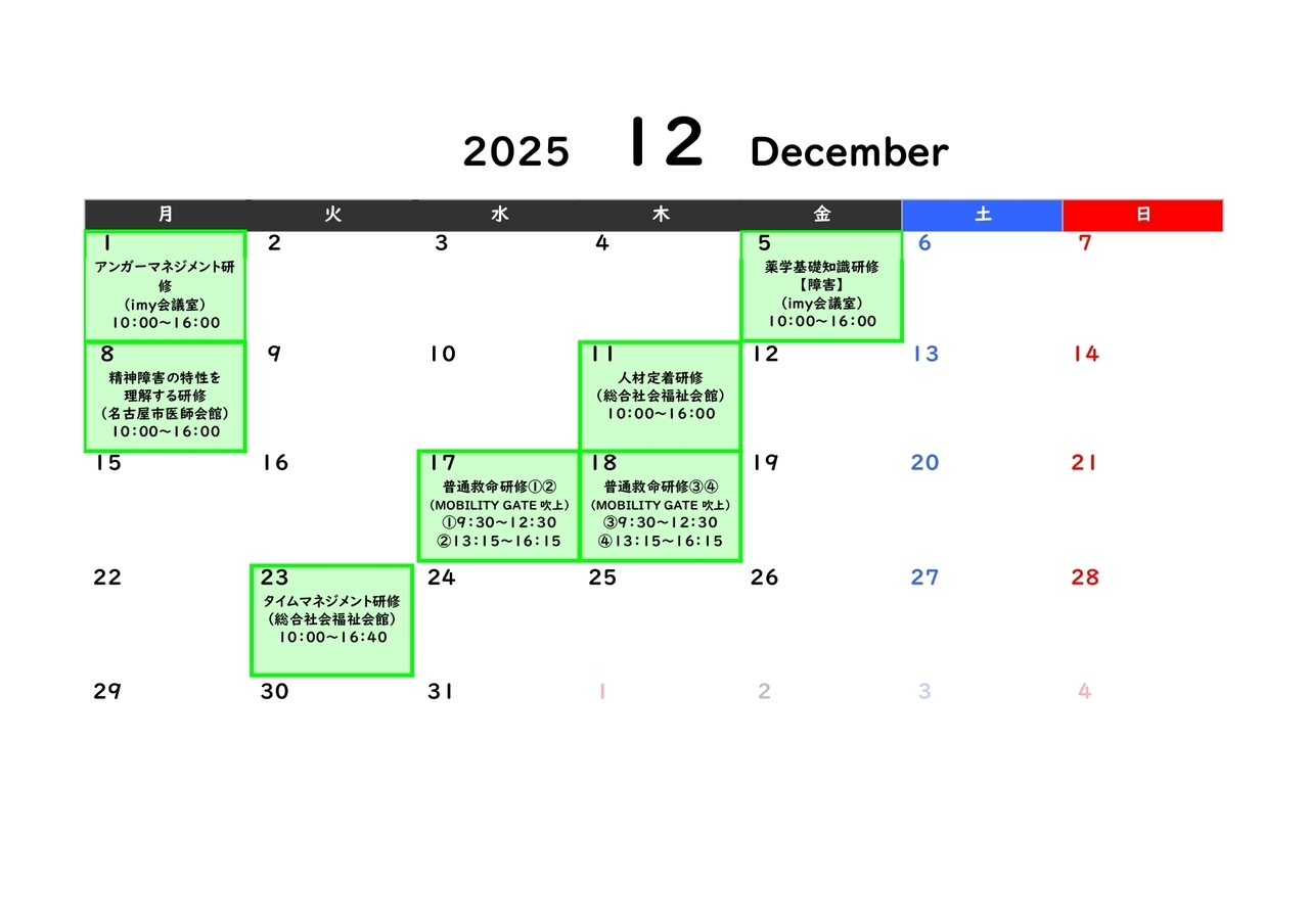 | 12/1 | 01 アンガーマネジメント研修(12/1集合) | 受付終了 |